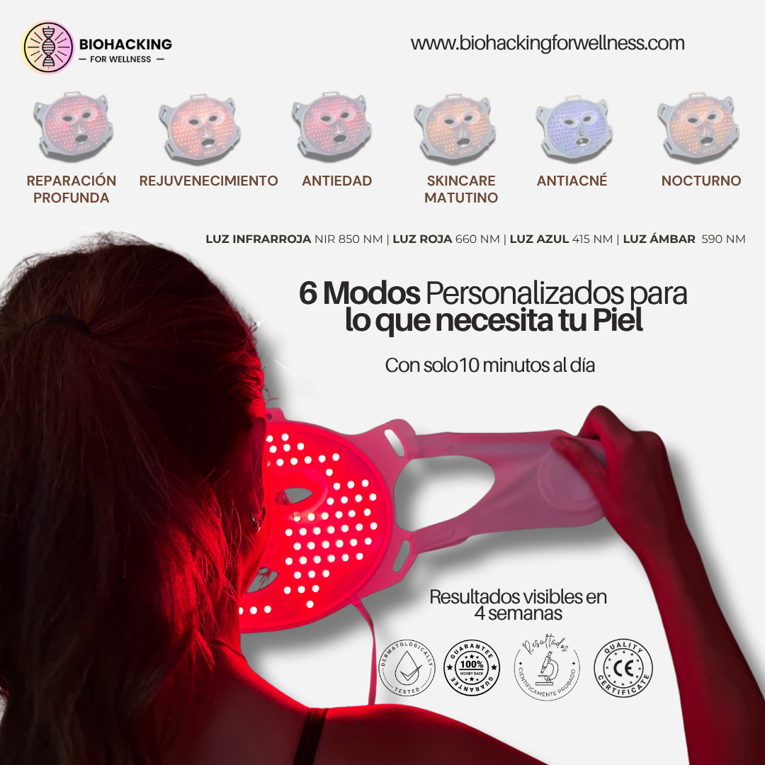 Es un dispositivo de fototerapia que utiliza diferentes longitudes de onda de luz LED, como la roja, azul, amarilla e infrarroja, para mejorar la salud y apariencia de la piel. Ayuda a tratar arrugas, acné, pigmentación y otros problemas de forma no invasiva.